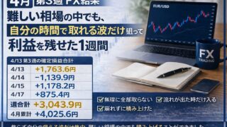 トレード結果 【4月第3週FX結果】難しい相場でも、自分の時間で取れる波だけを狙えた1週間 難しい相場の中でも崩れずにプラスを維持できた1週間のリアルなトレード記録。兼業トレーダーが実践する「自分の時間で取れる波だけ狙う」戦略を解説。 2026.04.19 トレード結果