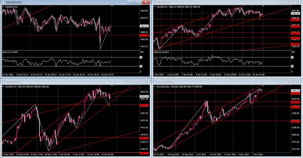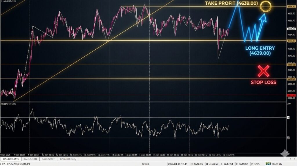 • 環境認識:日足・4時間足・1時間足は上昇トレンド